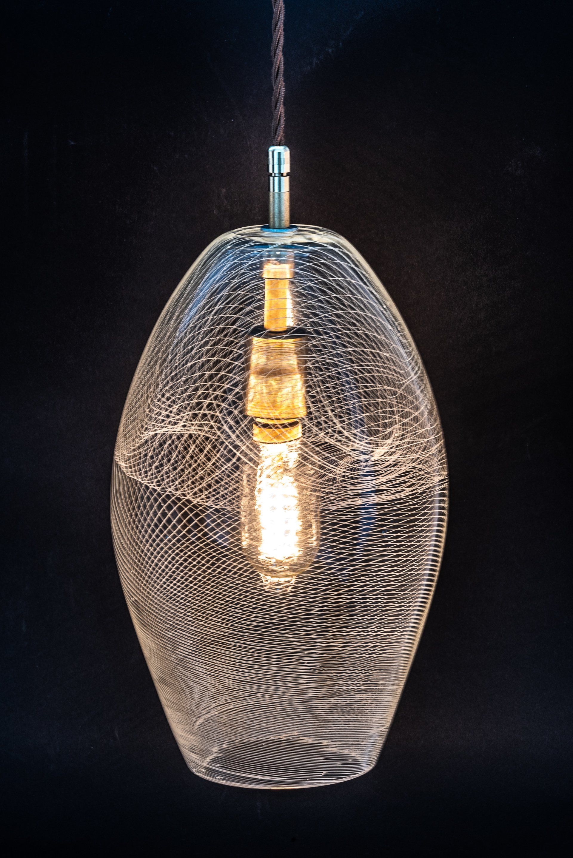Each piece is made by using thin white canes fused together that rolled up and twisted. Different shapes are available in this design.